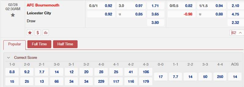 Bảng tỷ lệ kèo Bournemouth vs Leicester 2h30 ngày 28/2/2024