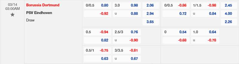 Bảng tỷ lệ kèo Dortmund vs PSV 3h00 ngày 14/3/2024