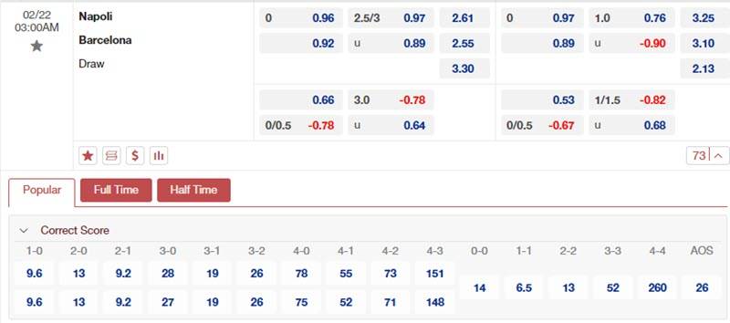 Bảng tỷ lệ kèo Napoli vs Barcelona 3h00 ngày 22/2/2024