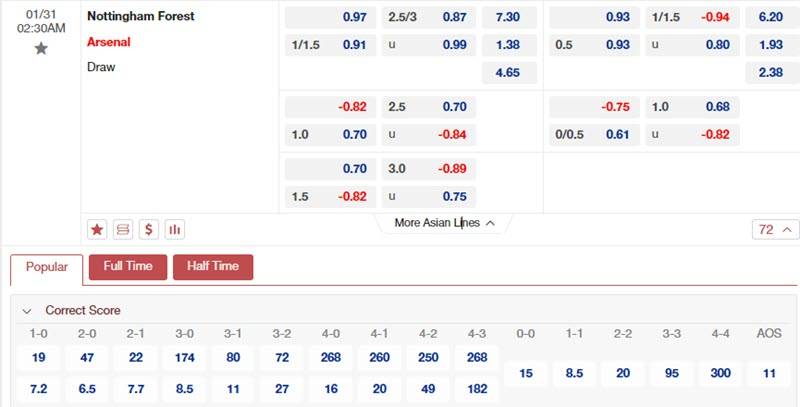 Bảng tỷ lệ kèo Nottingham vs Arsenal 02h30 ngày 31/1/2024