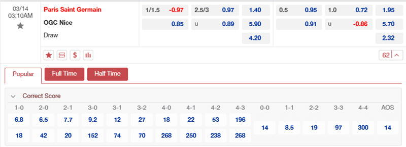 Bảng tỷ lệ kèo PSG vs Nice 3h10 ngày 14/3/2024