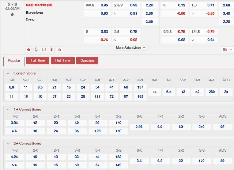 Bảng tỷ lệ kèo Real Madrid vs Barcelona 02h00 ngày 15/1/2024