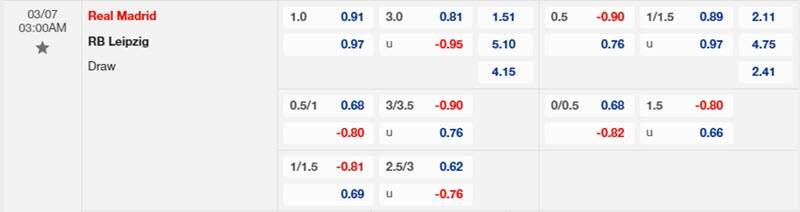 Bảng tỷ lệ kèo Real Madrid vs RB Leipzig 3h00 ngày 07/03/2024